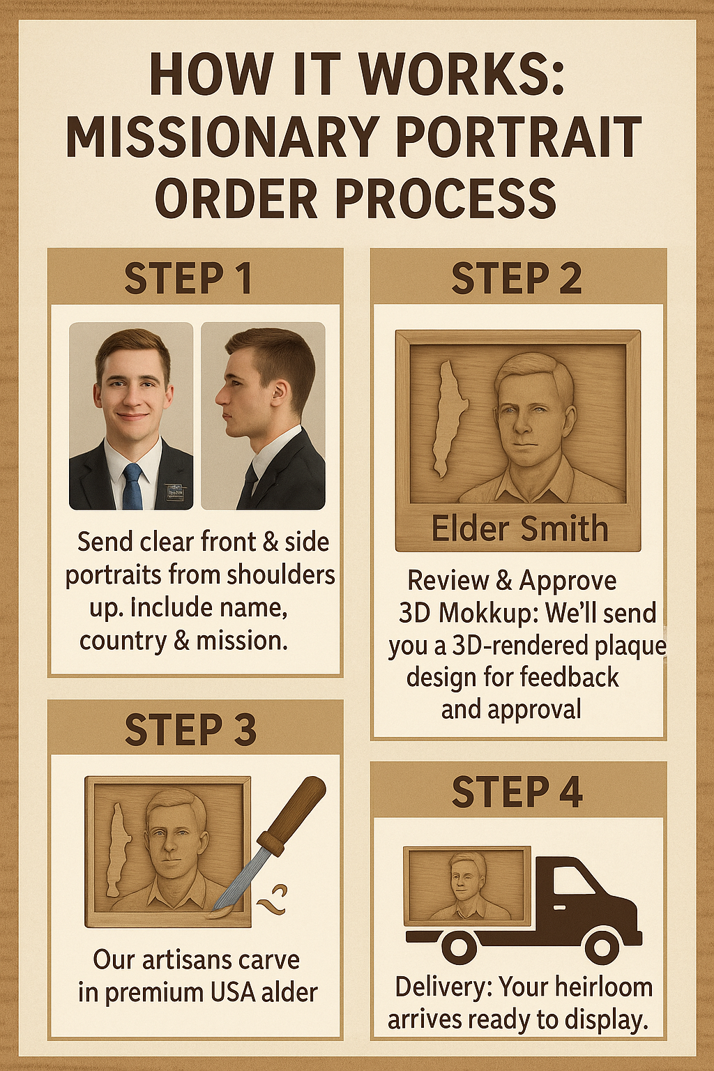 Celebrate the dedication and sacrifice of a missionary with a one-of-a-kind hand-carved wooden plaque. Each piece is designed from your submitted photos and mission details, then carefully carved and hand-finished with natural Earth friendly finishes to capture warmth, personality, and devotion in enduring USA sourced hardwood.
